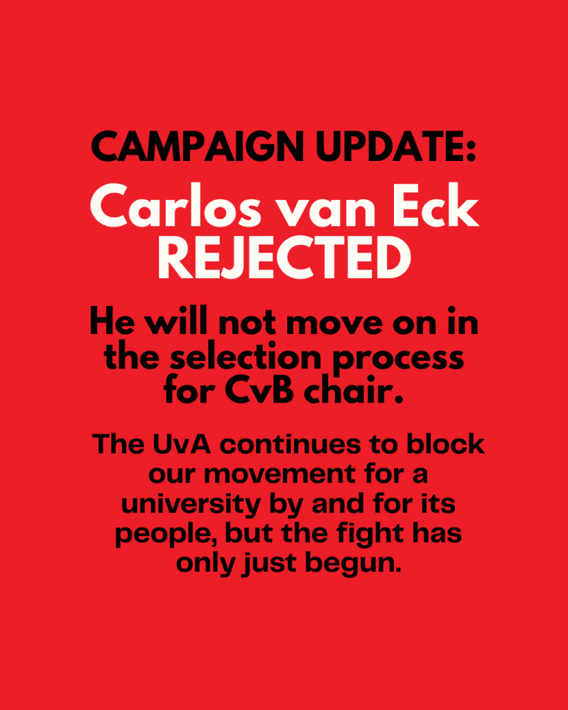 We see this as but one hurdle in our longer fight for a bottom-up model of university governance. It is time for a radical reckoning of the neoliberal “New Public Management” form of governance which dismisses our education as a diploma factory. We must do away with untransparent and undemocratic selection committees and supervisory boards. All power must return to the hands of the students and staff who comprise this university…